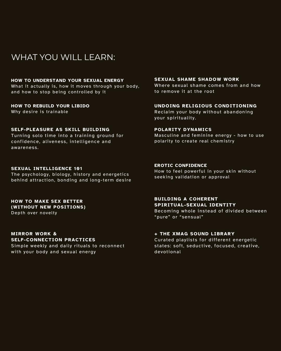 We are creating a new curriculum for the modern man and woman: a space to come home to their bodies, their intimacy and their eros.